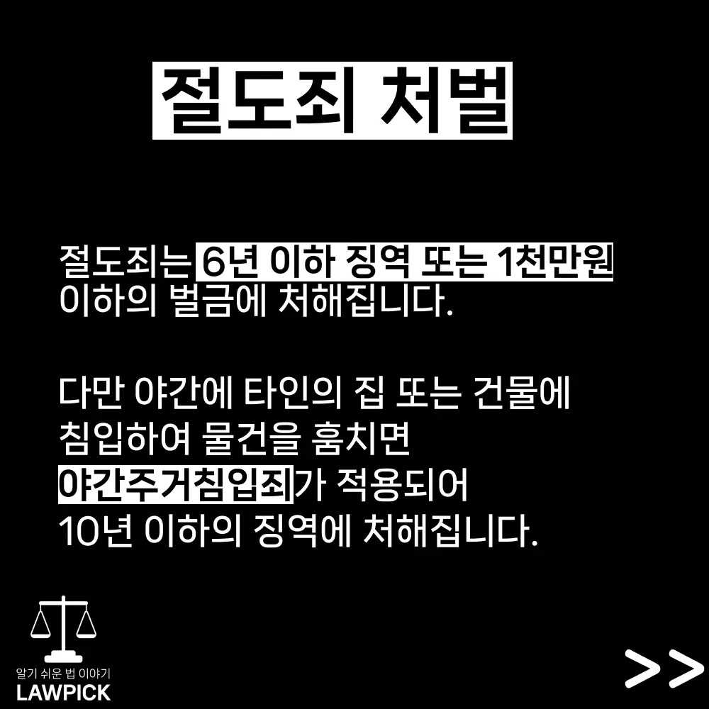 절도죄가 성립되면 6년 이하의 징역 또는 1천만 원 이하의 벌금형에 처해집니다. 야간에 타인의 저택 또는 건물에 불법 침입해 재물을 절취하면 야간주거침입죄가 적용돼 처벌 수위가 더 높아집니다. 10년 이하의 징역에 처해진다고 합니다.