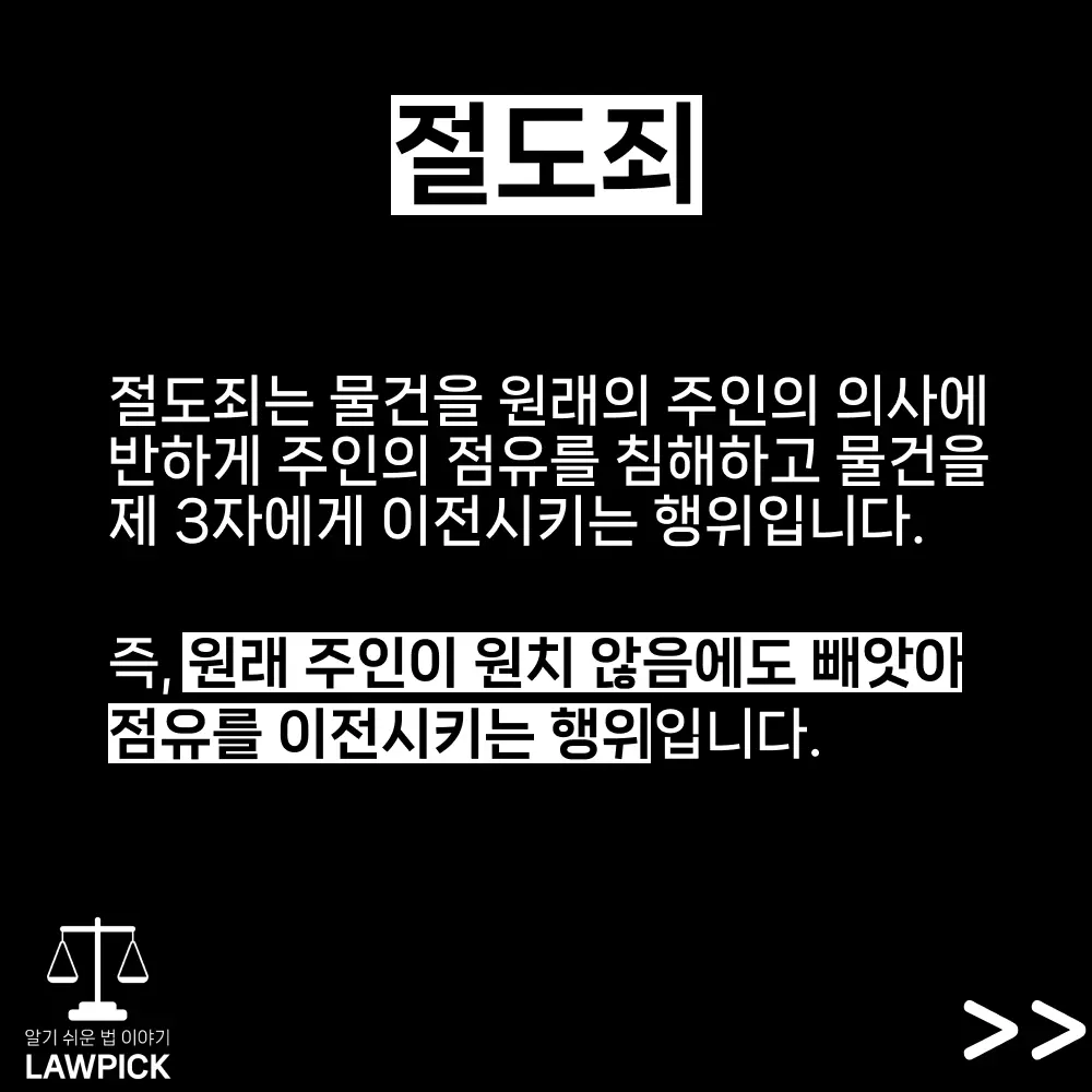 누군가 점유나 소유하고 있는 물건을 '고의적'으로 훔치면 절도죄가 성립됩니다. 횡령죄와는 다르게 점유물의 주인을 알고 있고 훔쳤을 때 성립됩니다.
